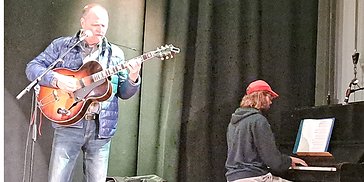 Ted Bjurwill och Olof Dahl-Bjurwill framför ”Krig och Kärlek”, en samling nya sånger av Ted.