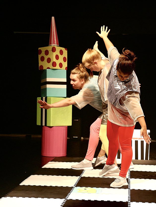 klämmer och utforskar Tio Fötter geometrins fysiska lagar på nya spännande sätt. En interaktiv teater med dans där barnen får vara med och styra dramaturgi och upplägg. Föreställningen tar även upp frågor om att passa in.