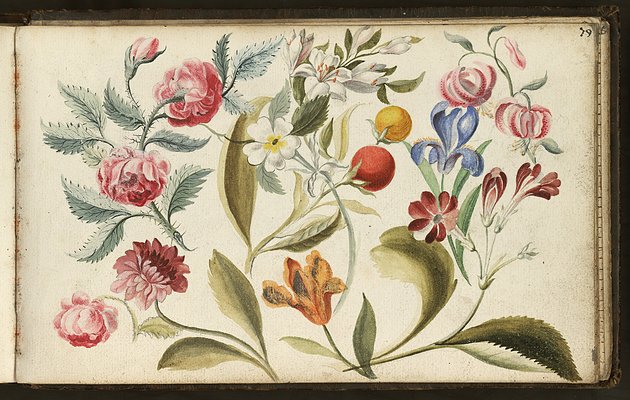 Barock illustration: Blommor och bär, akvarell av Anna Maria Thelott (1683-1710). Wikimedia Commons