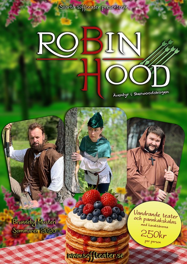 Följ med Robin Hood på den spännande vandringen genom Brunneby Musteris egen SherwoodSkog. Vi avslutar föreställningen med en härlig pannkaksbuffé tillsammans med karaktärerna från föreställningen.