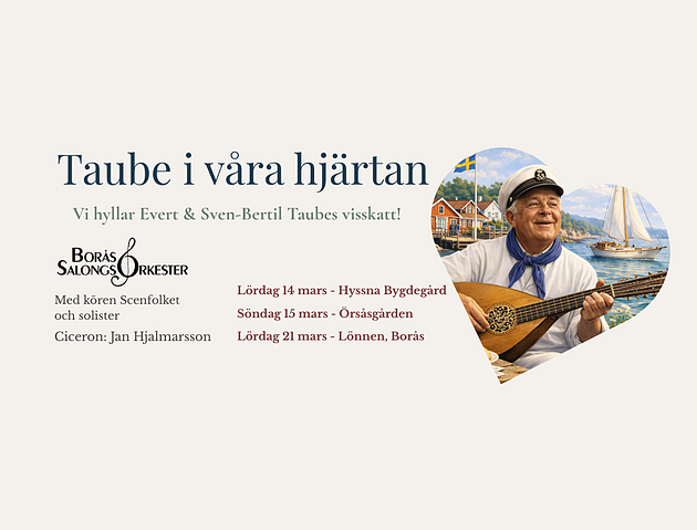 Välkommen till en musikalisk resa i Taubes fotspår. Med konserten Taube i våra hjärtan bjuder den 40-års-jubilerande Borås Salongsorkester, tillsammans med kören Scenfolket och flera solister in till en varm och levande konsert med musik av Evert och Sven-Bertil Taube. Det blir en generös melodibukett fylld av poesi, lyrik och tidlösa toner.
