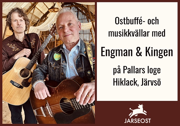 Välkommen till tre sommarkvällar (samt en extrainsatt kväll den 19 maj) med smak, stämning och sväng hos Jarseost! Kom in på logen och njut av en generös ostbuffé med lokala delikatesser, där alla ostar ystats i mejeriet på gården. Kvällen ackompanjeras av ett countrydoftande musikaliskt möte mellan boogiemästaren Kingen Karlsson och vår egen ystare och kapellmästare Pär Engman.